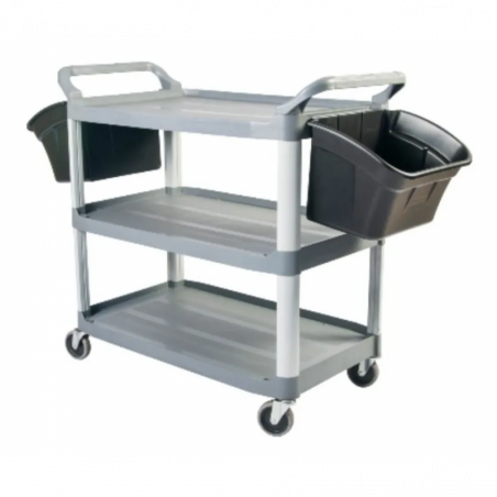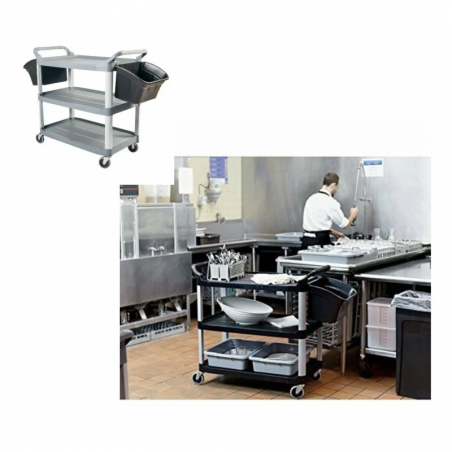 CARRO DE SERVICIO PORTA ELEMENTOS CON CANECAS Elaborado en ABS de alta resistencia. - Carro de servicio de tres niveles, generando mayor espacio para que el operador pueda hacer uso más eficiente del mismo. - Soporta 25 kg de peso repartidos entre los tres niveles para mayor duración de las ruedas y parales que están fabricados en aluminio de alto calibre - Se encuentra fabricado en plástico ABS para una mayor resistencia a golpes y durabilidad al paso del tiempo, sus ruedas son anti marcas logrando cuidar el piso de impurezas. - Garantía 12 meses. MEDIDAS - 103,2 cm x 50,8 cm x 96 cm COLOR - Gris Se entrega factura de régimen simplificado.