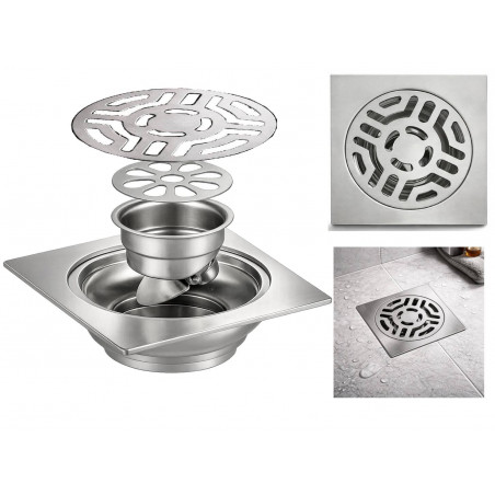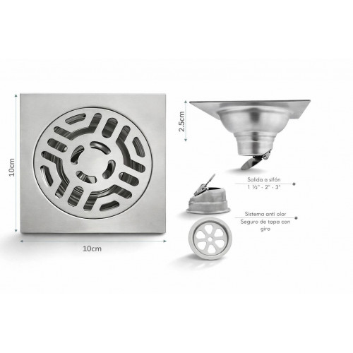 - Rejilla sifón de piso elaborada en acero para uso de baño o zona de ropas.