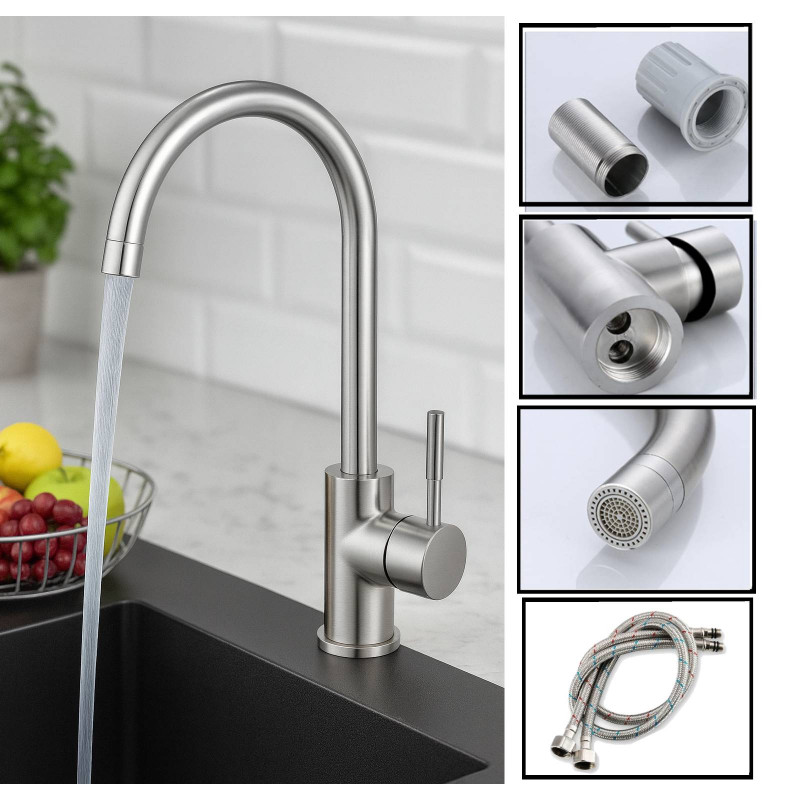 Eleva el diseño y la funcionalidad de tu cocina con esta grifería mezclador de lavaplatos en acero inoxidable 304, material premium que garantiza resistencia, durabilidad y un acabado cepillado moderno que no se oxida ni pierde brillo con el tiempo.