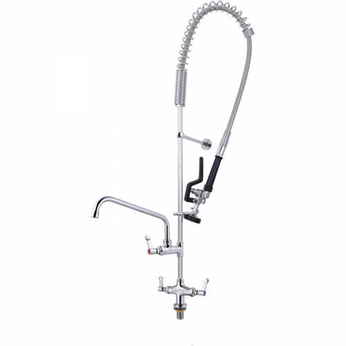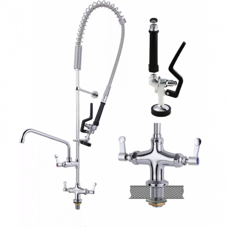 - Su sistema de doble cabezal permite tener cada salida de chorro en una poceta y girarlas de manera independiente. Esto facilita el uso en cocinas grandes, en restaurantes, hoteles o cocinas industriales. Cuenta con dos puntos de salida y cuellos giro horizontal para fácil uso.