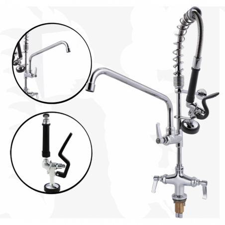 - Su sistema de doble cabezal permite tener cada salida de chorro en una poceta y girarlas de manera independiente. Esto facilita el uso en cocinas grandes , en restaurantes, hoteles o cocinas industriales. Cuenta don dos puntos de salida y cuellos giro horizontal para fácil uso.