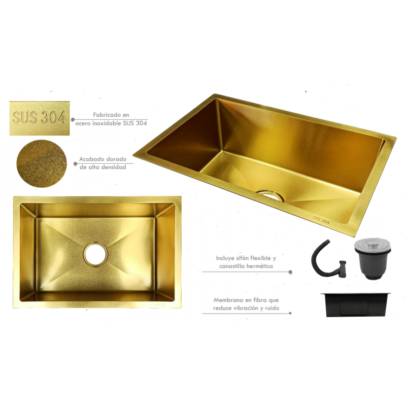 Presentamos nuestro innovador fregadero de acero inoxidable 304 acabado color dorado, un prodigio de resistencia y calidad. Fabricado con los más altos estándares, este fregadero está diseñado para ofrecer durabilidad y satisfacer las necesidades más exigentes.