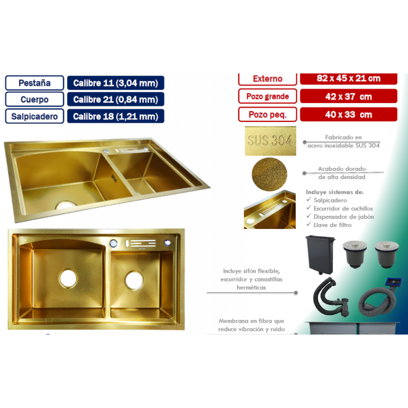 Lavaplatos doble poceta antiruido acero 304 acabado dorado oro