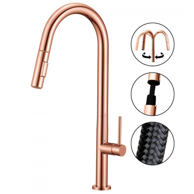 GRIFERIA LAVAPLATOS MONOCONTROL EXTRAIBLE 360 GRADOS ALEACION BRONCE PESADO BRILLANTE ORO ROSA PARA COCINA REFERENCIA ECLIPSE BASE ANCHA , CABEZAL ABS CONTROL DE CHORRO SUAVE, DISEÑO ESTILIZADO COLOR ORO ROSA BRILLANTE