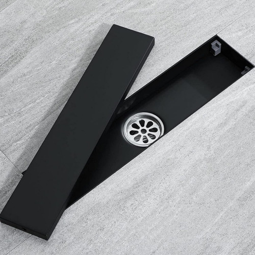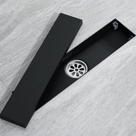 Rejilla lineal negra de piso de 30×10 cm con panel oculto en acero inoxidable 304. Diseño moderno y minimalista, drenaje eficiente y sistema anti-olor integrado. Ideal para baños y duchas de alto nivel estético.