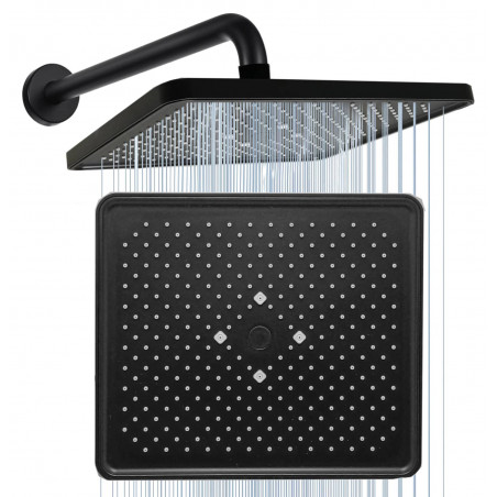 • Ducha metálica elaborada en Abs con acabado negro mate, con racor de enrosque y filtro de Sedimentos. Diseño rectangular con bordes suaves que permiten generar chorro tipo lluvia sin necesidad de alta presión.