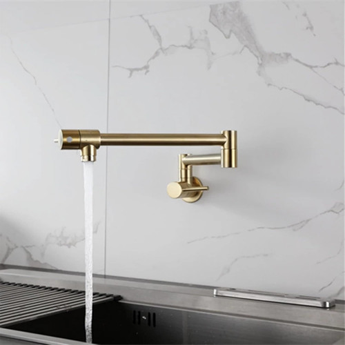 Transforma tu cocina con nuestro grifo de llenado de ollas en acero inoxidable 304 con acabado dorado opaco diseñado para combinar estilo, durabilidad y eficiencia. Este grifo de montaje en pared no solo ahorra espacio, sino que su brazo giratorio plegable te permite llenar tus ollas directamente sobre la estufa, haciendo tu rutina diaria mucho más cómoda.
