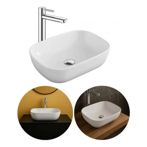 LAVAMANOS DE PORCELANA COLOR BLANCO DE SOBREPONER RECTANGULAR PARA PONER A MESON O MUEBLE INCLUYE GRIFERIA ACERO BRILLANTE AGUA FRIA , DESAGÜE Y SIFON