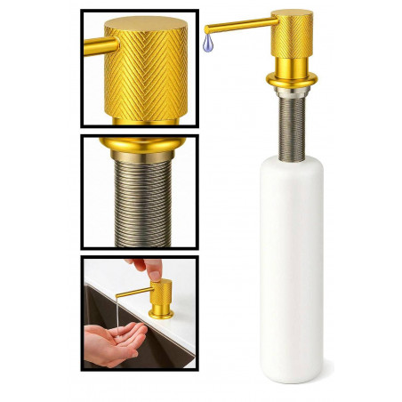 Un dispensador pensado para cocinas y baños de alto nivel. Su cabezal dorado brillante en alto relieve ofrece un agarre firme y un look moderno; el pico largo de 12 cm evita goteos en la encimera; la válvula de succión eficiente y el dosificador por goteo entregan la cantidad justa, sin desperdicios. La rosca larga de acero puro se adapta a mesones anchos, y el tanque de ABS de 500 ml te da autonomía por semanas. Es Línea Premier: calidad superior y acabados impecables, pensada para clientes que buscan lo mejor de lo mejor.