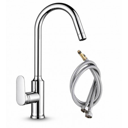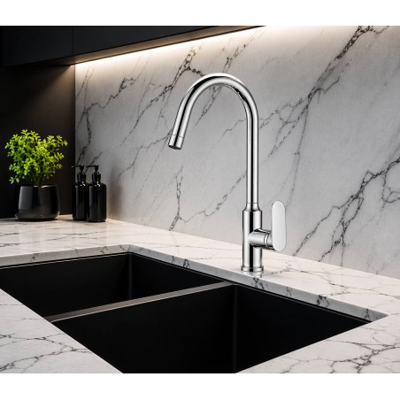 - Cuerpo y pico fabricados en bronce y acero con recubrimiento en cromo brillante - Cuello giro suave de facil uso - Altura 39cm con salida de 20cm, especial para lavaplatos grande. - Cierre suave de cero friccion - Sistema de cierre de cartucho cerámico. - Incluye aireador para un chorro más confortable. - Recomendado para uso de fregaderos de cocina o en lavaderías. - Pico giratorio para facilitar las labores de limpieza. CARACTERÍSTICAS: - Superficie libre de defectos o rayaduras. - Producto probado para resistir oxidación o corrosión. - Funcionamiento adecuado desde 20 hasta 125 PSI. - Sistema de cierre probado hasta los 500.000 ciclos, sin presentar fugas. - Sistema de cierre probado hasta las 500 PSI, sin presentar fugas