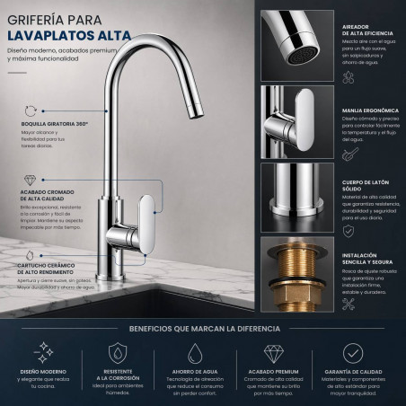Griferia Lavaplatos Monocontrol De Lujo Economizadora alta, mezclador agua fria y caliente