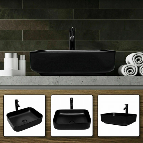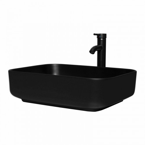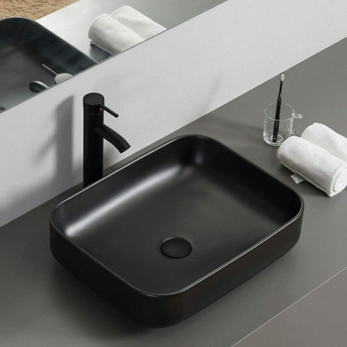 - Lavamanos negro mate en porcelana con diseño rectangular bordes suaves diseño pool de 50 X 41 X 14 cm en profundidad.
