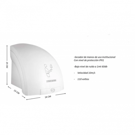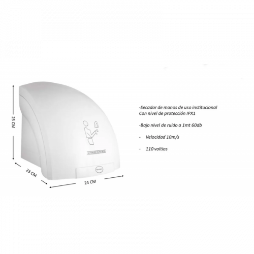 - Secador de manos automático de uso institucional, con velocidad del aire de 12 metros por segundo, logrando un secado de las manos de 15 a 20 segundos, maneja aire calidad que ayuda a un secado mas rápido.